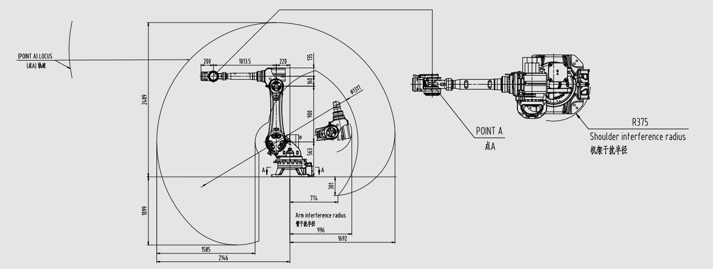 下图为机器人臂展活动范围,供您参考。更多码垛机咨询,欢迎持续关注青岛艾讯官方网站: