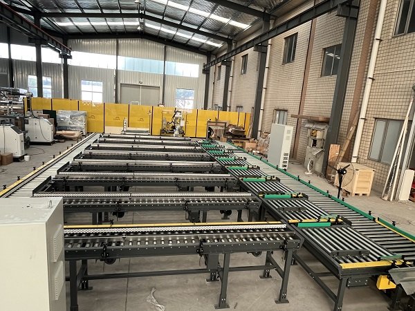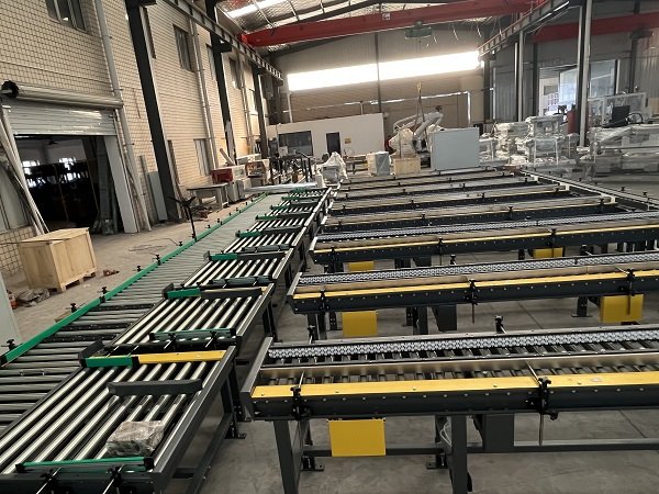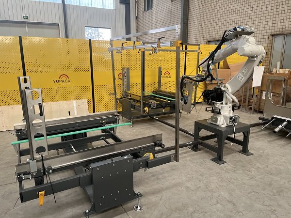 该线体主要功能是对卡丁车和赛车轮胎进行装箱和码垛。线体最大亮点是,客户一共有8条产线4种纸箱尺寸同时混产,针对客户的现实情况,艾讯采用了机器人+动力料仓+自适应折底封底机的结构,通过信号交互,来确定取哪款纸箱,开哪款纸箱,再通过信号识别,将纸箱输送到指定的装箱工位。同时该线体还配备了实时贴标加在线打印功能,通过和上位机的实时通讯,来确定纸箱需要打印的标签内容。