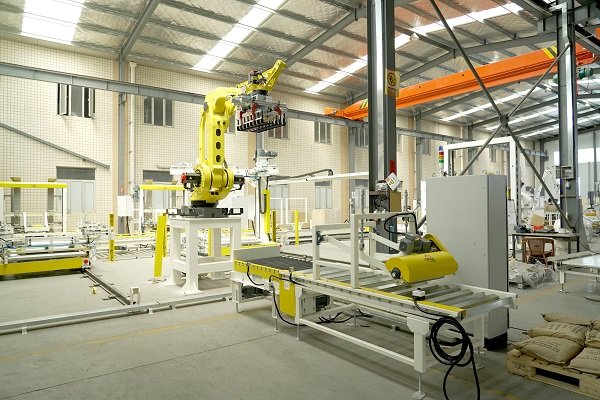 根据不同的物料情况,艾讯会配备不同的袋整形以及压平机构,同时也可以根据用户的实际产量情况,由一台码垛机器人兼容一条或多条来料线,共同码垛,成本低,效率高,占地面积小。